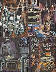 The Batcave made its comic book debut in Detective Comics #83 in January 1944.[3] Over the decades, the cave has expanded along with its owner's popularity to include a vast trophy room, supercomputer,[4] and forensics lab. There has been little consistency as to the floor plan of the Batcave or its contents. The design has varied from artist to artist and it is not unusual for the same artist to draw the cave layout differently in various issues.