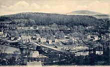 Situated at the head of navigation on the Connecticut River, and shielded from strong winds by the Green Mountains to the west and White Mountains to the east, Bath soon developed into "...one of the busiest and most prosperous villages in northern New Hampshire." [3] Intervales provided excellent alluvial soil for agriculture, and the Ammonoosuc and Wild Ammonoosuc rivers supplied water power for mills. The population reached 1,627 in 1830, when 550 sheep grazed the hillsides.[2] A vein of copper was mined. The White Mountains Railroad up the Ammonoosuc River Valley opened August 1, 1853, shipping Bath's lumber, potatoes, livestock and wood pulp. By 1859, the town had two gristmills and two sawmills.[4] Other industries would include a woolen mill, creamery, distillery and two starch factories.[5]