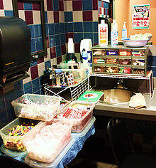 The attendant may turn on the tap and provide soap and towels. At the attendant's work station, an assortment of items may be available for purchase or for free such as mints, perfume or cologne, mouthwash, chewing gum, cigarettes,[4] pain relievers, condoms, and energy drinks.[5] Many attendants keep a tip jar at their work stations for patrons to leave tips for either the attendant's services, such as handing patrons hand-towels, or for taking or using any of the aforementioned items from the work station. Many times attendants are expected to invest in the items offered at their workstations in order to profit through earning tips. Some attendants make their living exclusively from tips they earn while some receive a base hourly wage in addition to the tip.[6]