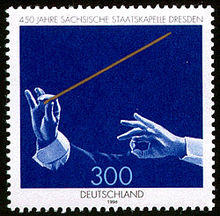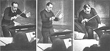 The usual way of holding the baton is between the thumb and the first two fingers with the grip in against the palm of the hand. The baton is usually held in the right hand though some left-handed conductors hold it in the left. Young left-handed conductors are, however, sometimes encouraged to learn right-handed conducting.[5] Some conductors like Pierre Boulez, Georges Prêtre, Leopold Stokowski, Valery Gergiev, and Dimitri Mitropoulos, however, choose not to hold a baton, preferring to conduct only with their hands. This method is common with smaller groups and choral conductors.[3] If the conductor does not use a baton, their hands must do the job with equal clarity, and the gestures must be first and always meaningful in terms of the music.[6] According to Gustav Meier, most conductors use a baton to "increase the visibility of the beat information".[7]