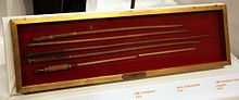 Modern batons are generally made of a lightweight wood, fiberglass or carbon fiber which is tapered to a comfortable grip called a "bulb" that is usually made of cork, oak, walnut, rosewood, or occasionally aluminium and that may be tailored to a conductor's needs. Professional conductors often have personal specifications for a baton based on their own physical demands and the nature of the performance: Sir Henry Wood and Herbert von Karajan are some examples.[1] Historic examples of their construction include one given to the French composer Louis-Antoine Jullien in the mid 1850s prior to his first visit to the United States: it is described as "a gorgeous baton made of maplewood, richly mounted in gold and set with costly diamonds."[2]