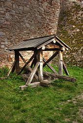 A battering ram is a siege engine that originated in ancient times and was designed to break open the masonry walls of fortifications or splinter their wooden gates. In its simplest form, a battering ram is just a large, heavy log carried by several people and propelled with force against an obstacle; the ram would be sufficient to damage the target if the log were massive enough and/or it were moved quickly enough (that is, if it had enough momentum). Later rams encased the log in an arrow-proof, fire-resistant canopy mounted on wheels. Inside the canopy, the log was swung from suspensory chains or ropes.
