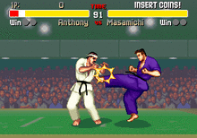 The gameplay has a 6-button layout, but with command inputs different compared to ones in most fighting games released at the time. There are three punches and kicks for a few directions (weak, medium and strong). There are seven fighting styles featured in the game and two playable characters per style, for a total of 14 playable fighters.