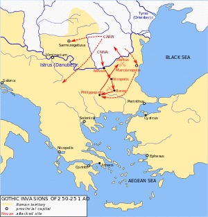 In 250 a tribal coalition under Cniva crossed the Roman Danube frontier, probably advancing in two columns. Whether these were consisted only of Goths is rather unlikely so the name "Scythians" by which the Greek sources called them (a geographical definition) seems more appropriate.[11] It is quite possible that other people of Germanic and Sarmatian origin (like Bastarnae, Taifals, and Hasdingian Vandals), perhaps Roman deserters as well, had joined the invaders.[12] However, the name of the king is indeed Gothic and probably genuine.[13] Meanwhile, the Carpi invaded Dacia, eastern Moesia Superior, and western Moesia Inferior.[14]