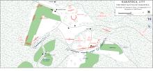 The Battles of Saratoga (September 19 and October 7, 1777) marked the climax of the Saratoga campaign, giving a decisive victory to the Americans over the British in the American Revolutionary War. British General John Burgoyne led a large invasion army southward from Canada in the Champlain Valley, hoping to meet a similar British force marching northward from New York City and another British force marching eastward from Lake Ontario; the southern and western forces never arrived, and Burgoyne was surrounded by American forces in upstate New York. He fought two small battles to break out which took place 18 days apart on the same ground, 9 miles (14 km) south of Saratoga, New York. They both failed.
