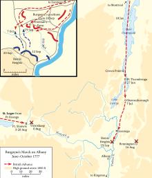 British General John Burgoyne moved south from the province of Quebec in June 1777 to gain control of the upper Hudson River valley. His campaign had become bogged down in difficulties following a victory at Fort Ticonderoga.[13] Elements of the army had reached the upper Hudson as early as the end of July, but logistical and supply difficulties delayed the main army at Fort Edward. One attempt to alleviate these difficulties failed when nearly 1,000 men were killed or captured at the August 16 Battle of Bennington.[14] Furthermore, news reached Burgoyne on August 28 that St. Leger's expedition down the Mohawk River valley had turned back after the failed Siege of Fort Stanwix.[15]