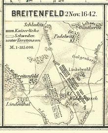 The Second Battle of Breitenfeld, also known as the First Battle of Leipzig, took place on 23 October 1642 at Breitenfeld, some 7.5 kilometres (4.7 mi) north-east of Leipzig, Germany, during the Thirty Years' War. The battle was a decisive victory for the Swedish army under the command of Field Marshal Lennart Torstenson over an Imperial Army of the Holy Roman Empire under the command of Archduke Leopold Wilhelm of Austria and his deputy, Prince-General Ottavio Piccolomini, Duke of Amalfi.[1]