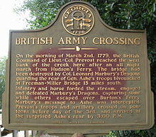 Campbell led the troops south until they reached Ebenezer, burning the bridge across Brier Creek on the way. At Ebenezer he turned command of the column over to General Prevost's younger brother, Lieutenant Colonel Mark Prevost, and headed down the river to return to England.[11] General Ashe trailed after Campbell, and on February 26 camped near the confluence of Brier Creek and the Savannah River, about 15 miles (24 km) to the north. Ashe set his men to repairing the bridge.[12][13] While encamped there, he was joined by about 200 light cavalry and some additional light infantry units, swelling his force to about 1,300 men.