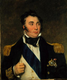 Dom Pedro, who was currently trapped and besieged in Oporto by the forces of Dom Miguel, bestowed on Napier his commission as Vice Admiral, Major General of the Portuguese Navy and Commander in Chief of the fleet. An eccentric but indomitable character, Napier restored order among the fleet, which had been close to mutiny due to lack of pay, and proposed a new strategy to break the siege. Flying his flag in the frigate Rainha de Portugal, commanded by Captain F.G. MacDonough and with his stepson Charles Elers Napier as Chief of Staff, on 20 June he set sail from Oporto with his small fleet. The initial aim for Napier was to transport the Duke of Terceira and half the total armed forces available to the Liberal to the Algarve so that they could open a second front in the south of the country against the Miguelite forces and march on and capture Lisbon. After successfully disembarking this force, on the return voyage he encountered the considerably superior fleet of Dom Miguel under the command of Miguelite admiral Manuel Marreiros off Cape St. Vincent on 3 July 1833, and after two days of manoeuvring in calm and very light winds he engaged the Miguelite fleet.[8][9]