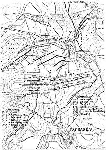 Instructed to hold until Frederick reached him, Leopold deployed south of Chotusice, his infantry facing south-east, with cavalry on either flank. The left was commanded by Waldow, the right by the 70 year old veteran von Buddenbrock, Leopold leaving room for Frederick's infantry to deploy when they arrived. Charles of Lorraine hoped to attack before Frederick could reach him but was not ready to do so until 7:00 am; as he advanced north from Čáslav, his army drifted slightly to the right, allowing Buddenbrock's cavalry to outflank them.[11]