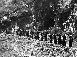 On 8 May, the Viet Minh counted 11,721 prisoners, of whom 4,436 were wounded.[11] This was the greatest number the Viet Minh had ever captured, amounting to one-third of the total captured during the entire war. The prisoners were divided into groups. Able-bodied soldiers were force-marched over 600 km (370 mi) to prison camps to the north and east,[98] where they were intermingled with Viet Minh soldiers to discourage French bombing runs.[99] Hundreds died of disease along the way. The wounded were given basic first aid until the Red Cross arrived, extracted 858 prisoners, and provided better aid to the remainder. Those wounded who were not evacuated by the Red Cross were sent into detention.[100]