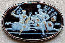 In his sixties, the aged Valerian marched eastward to the Sasanian borders. According to Shapur I's inscription at the Ka'ba-ye Zartosht, Valerian met the main Persian army, under the command of Shapur I, between Carrhae and Edessa (in Middle Persian: Urhāy), with units from almost every part of the Roman Empire, together with Germanic allies,[7] and was thoroughly defeated and captured with his entire army.[4][8]