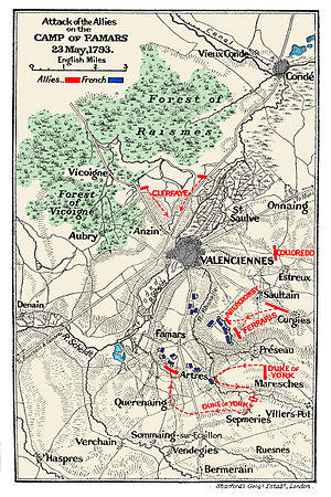 Although the French held their ground to the north Lamarche realised he was in danger of being cut off. Leaving Ferrand to defend Valenciennes, during the night the Republicans withdrew towards Bouchain, Caesar's Camp and Paillencourt.[9] The next morning York attacked, but the French had gone. Colloredo's column from the north were the first to enter the camp.