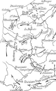 From 17 September to 17 October 1914, the belligerents had made reciprocal attempts to turn the northern flank of their opponent. Joffre ordered the French Second Army to move to the north of the French Sixth Army, by moving from eastern France from 2 to 9 September and Falkenhayn ordered the German 6th Army to move from the German-French border to the northern flank on 17 September. By the next day, French attacks north of the Aisne led to Falkenhayn ordering the 6th Army to repulse French forces and secure the flank.[1] When the French Second Army advanced, it met a German attack rather than an open flank on 24 September; by 29 September, the Second Army comprised eight corps but was still opposed by German forces near Lille, rather than advancing around the German northern flank. The German 6th Army had also found that on arrival in the north, that it was forced to oppose the French attack, rather than advance around the flank; the secondary objective of protecting the northern flank of the German armies in France had become the main task. By 6 October, the French needed British reinforcements to withstand German attacks around Lille. The BEF had begun to move from the Aisne to Flanders on 5 October and with reinforcements from England, assembled on the left flank of the Tenth Army, which had been formed from the left flank units of the Second Army on 4 October.[2]