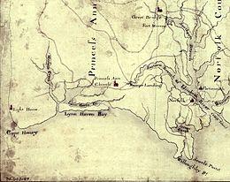 Tensions in the British Colony of Virginia were raised in April 1775 at roughly the same time that the hostilities of the American Revolutionary War broke out in the Province of Massachusetts Bay with the Battles of Lexington and Concord. John Murray, 4th Earl of Dunmore, the royal governor of Virginia, had dismissed the colonial legislative assembly, the House of Burgesses, who then established a provisional assembly in Virginia Conventions. The Burgesses authorized existing and newly raised militia troops to arm themselves, leading to a struggle for control of the colony's military supplies. Under orders from Lord Dunmore, British forces removed gunpowder from the colonial storehouse in the capital of Williamsburg, causing a confrontation between royal and militia forces.[6] Although the incident was resolved without violence, Dunmore, fearing for his personal safety, left Williamsburg in June 1775 and placed his family on board a Royal Navy ship.[7] A small British fleet then took shape at Norfolk, a port town whose merchants had significant Loyalist (Tory) tendencies. The threat posed by the British fleet may also have played a role in minimizing Whig activity in the town.[8]