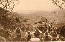 The American cavalry pursued the soldiers that had retreated from Coamo, but were not able to reach them until the units had entered Aibonito Pass, a region more commonly known as Asomante. The region had been prepared by allied Puerto Rican and Spanish troops, who had built a trench and placed soldiers and equipment around the foliage.[43] As soon as the soldiers noticed the presence of the invading unit they opened cannon fire. The cavalry received infantry reinforcements, which were received by battery fire. Six American soldiers were injured in the crossfire, prompting a retreat order.[43] The allied units (Spanish and Puerto Rican) lost five soldiers and two civil guards.[43] During the following two days the Americans decided to do a battlefield reconnaissance and Colonel S. Reber, developed a croquis of the Aibonito Pass. Spies were deployed throughout Coamo, including a Puerto Rican separatist named Carlos Patterne, who was able to enter the city without suspicion and contact Rufino Huertas, a separatist teacher.[44] Huertas gave Patterne a series of defense plans that were previously developed and organized by Martínez Illescas.[44] While inactive, the Puerto Rican soldiers deployed in Asomante completed rounds every two hours, working four hours daily. They mostly ate beans, some rice and meat, while conserving several cracker packs for Spanish reinforcements that were supposed to arrive.[45] They slept in improvised huts that did not protect them from the rain.[45]