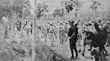 Shortly after the American soldiers disembarked, a group of Spanish and Puerto Rican units began moving from Ponce to Aibonito, marching through the Carretera Central (Central Road). The caravan was composed of two companies of the Batallón de Cazadores de la Patria (Battalion of the Motherland's Hunters) and some members of the Civil Guard and a Puerto Rican guerilla force. A total of 248 infantry men and 42 members of the cavalry formed the battalions under the command of Lt. Col. Rafael Martínez Illescas, the same commander who was in charge of the Ponce garrison.[38] Traveling by foot, the journey would last two days. The group decided to spend one night in the resort of the town of Coamo known as the Baños de Coamo before continuing their march in the morning.[38][39] Martínez Illescas immediately ordered the construction of several trenches; while building these, the soldiers were ambushed by an anti-Spanish guerilla force, led by Pedro María Descartes, who managed to kill a member of the Civil Guard.[38]