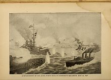 The first engagement between the belligerents occurred on May 8, 1898, when the converted liner USS Yale captured a Spanish freighter, Rita, in San Juan Bay. On May 9, Yale fought a brief battle with Alfonso XIII, a Spanish auxiliary cruiser, resulting in a Spanish victory.[20] Around this time, Captain Ángel Rivero Méndez was assigned the command of the Spanish forces at the fortress of San Cristóbal in San Juan. On May 10, when Yale returned to San Juan Bay, Rivero-Méndez ordered his men to open fire on the steamer with an Ordoñez 15 centimeter cannon, in the first attack against American forces in Puerto Rico during the Spanish–American War.[21] For his actions, Rivero-Mendez was awarded the "Cruz de la Orden de Merito Militar" (The Cross of the Order of the Military Merit) first class.[21]