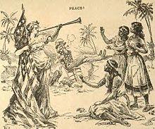 The American commanders decided to attack the trenches with artillery, while sending a large group to Barranquitas, from which they would try to attack the allied troops from the back.[46] At 10:30 a.m. Captain R.D. Potts led part of the 3rd Wisconsin Volunteer Infantry Regiment through the central highway to Aibonito. Lieutenants Bliss and O'Hern led two units with similar equipment. At 1:00 p.m. the allied troops opened cannon fire as the Americans entered their range.[47] Potts ordered the deployment of two batteries while O'Hern received orders from Commander Landcaster to set a cannon at a distance of a 100 yards to the vanguard's right.[47] They intended to defeat a small group led by Captain Hernaíz. Shrapnel from allied cannon fire was falling close to Lancaster's location, and he asked Potts to help him by deploying a battery nearby. One of Hernaíz's Placensias cannons overheated, which forced him to order a temporary cease to the offensive.[48] Landcaster believed that the opposition had been annihilated, ordered an advance. However, the allied fire was renewed, this time supported by Mauser rifle fire. The sudden attack caused confusion among some soldiers, who reported seeing a second Spanish unit nearby.[49] Fearing that the allied units could capture the American equipment, Landcaster ordered a retreat. Lieutenant Hains was gravely injured by a Mauser bullet, being replaced by Sergeant John Long. Meanwhile, most of Potts' men fled the battlefield. In the crossfire the allied forces overpowered the American infantry, using Mauser fire to disorganize their artillery,[50] during which time four American officials were gravely injured including Long, Lieutenant Harris, Captain E.T. Lee and Corporal Oscar Sawanson.[51] Private Frederick Yough, Corporal August Yank, George J. Bruce and Private Sices also received injuries, with Yough subsequently dying. Harris' position was filled by O'Hern, while Sawanson was fatally shot while trying to support the artillery. In total the allied units had only an injured artillery man, while the American side had two dead and five injured. Wilson's camp was the first to receive a telegram from General Miles notifying him that the war had ended. The Americans sent Bliss to Asomante, but Nouvilas refused to suspend the hostilities after receiving a telegram from Macías denying any peace treaty.[52] All military actions in Puerto Rico were suspended August 13, after President William McKinley and French Ambassador Jules Cambon, acting on behalf of the Spanish government, signed an armistice whereby Spain relinquished its sovereignty over the territory of Puerto Rico.[12]
