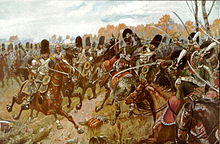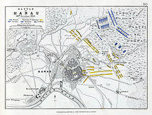 Wrede, following successful skirmishing against the French, began to deploy his forces to face the main French force of 20,000. On 30 October Wrede placed his centre with the River Kinzig behind it, and his right wing to its south in an isolated position with only a single bridge linking it with the main force. Napoleon had only 17,000 troops[10] including Marshal MacDonald’s infantry and General Sébastiani’s cavalry to face the enemy forces blocking them. Due to dense forests on the east of Wrede’s positions the French were able to advance and make close contact with the allies almost unseen.[10] Napoleon decided to attack the allies' left with all available troops. By midday Marshal Victor and MacDonald had cleared the forest in front of the allies' centre. Soon after, General Drouot found a track in the forest towards Wrede’s left on which cannon could be moved. Three hours later Grenadiers of the Old Guard had cleared the area of allied troops and Drouot began to deploy 50 cannons supported by cavalry of the Guard and Sébastiani.[10] A brief artillery bombardment from Drouot’s cannons silenced Wrede’s 28 cannons. French cavalry then attacked and pushed back Wrede’s cavalry on his left flank, then attacked the flank of Wrede’s centre. Wrede’s centre started to fall back, skirting the banks of the Kinzig River and suffering heavy casualties. On the right wing, Wrede’s forces tried to cross the single bridge over the Kinzig River to reinforce the centre, but many drowned in the attempt.[10] Wrede was successful in rallying his troops to form a defensive line running from Lamboy Bridge to the town of Hanau. During the night the allies abandoned Hanau. The French occupied Hanau on 31 October with little resistance. Napoleon made no effort to pursue Wrede, the main road to Frankfurt was now reopened, the French retreat continued.
