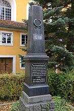 A granite monument, inlaid with a bronze plaque, was erected by the inhabitants of Hochkirch in memory of "Generalfeldmarschall Jacob von Keith" and his achievement. The inscription reads "Suffering, Misery, Death."[37]