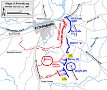 Grant's first objective was to secure the three remaining open rail lines that served Petersburg and the Confederate capital of Richmond: the Richmond and Petersburg Railroad; the South Side Railroad, which reached to Lynchburg in the west; and the Petersburg Railroad, also called the Petersburg and Weldon Railroad, which led to Weldon, North Carolina, and connected to the Wilmington and Weldon Railroad which led to the Confederacy's only remaining major port, Wilmington, North Carolina. Grant decided on a wide-ranging cavalry raid (the Wilson-Kautz Raid)[4] against the South Side and Weldon railroads, but he also directed that a significant infantry force be sent against the Weldon closer to his current position. Meade selected the II Corps, temporarily commanded by Maj. Gen. David B. Birney while Maj. Gen. Winfield S. Hancock was suffering from his lingering wound incurred at Gettysburg,[5] and the VI Corps, commanded by Maj. Gen. Horatio G. Wright. The positions in the trench lines occupied by these two corps were to be filled in by units of the Army of the James that would be moved from Bermuda Hundred.[6]