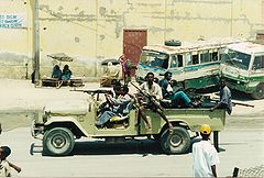 In January 1991, Somalian president Mohammed Siad Barre was overthrown in the ensuing civil war by a coalition of opposing clans.[16] The Somali National Army concurrently disbanded and some former soldiers reconstituted as irregular regional forces or joined the clan militias.[17] The main rebel group in the capital Mogadishu was the United Somali Congress (USC),[16] which later divided into two armed factions: one led by Ali Mahdi Muhammad, who became president, and the other by Mohamed Farrah Aidid. In total, there were four opposition groups that competed for political control – the USC, Somali Salvation Democratic Front (SSDF), Somali Patriotic Movement (SPM) and Somali Democratic Movement (SDM). In June 1991, a ceasefire was agreed to, but failed to hold. A fifth group, the Somali National Movement (SNM), later declared independence in the Somalia's northwest portion in June. The SNM renamed the unrecognized territory Somaliland, with its leader Abdirahman Ahmed Ali Tuur selected as president.[18]
