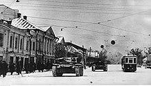 In the south, near Tula, combat resumed on 18 November 1941, with the Second Panzer Army trying to encircle the city.[57] The German forces involved were extremely battered from previous fighting and still had no winter clothing. As a result, initial German progress was only 5–10 km (3.1–6.2 mi) per day.[63] Moreover, it exposed the German tank armies to flanking attacks from the Soviet 49th and 50th Armies, located near Tula, further slowing the advance. Guderian nevertheless was able to pursue the offensive, spreading his forces in a star-like attack, taking Stalinogorsk on 22 November 1941 and surrounding a Soviet rifle division stationed there. On 26 November, German tanks approached Kashira, a town controlling a major highway to Moscow. In response, a Soviet counterattack was launched the following day. General Pavel Belov's 2nd Cavalry Corps, 1st Guards Cavalry Division, 2nd Guards Cavalry Division supported by hastily assembled formations, which included 173rd Rifle Division, 9th Tank Brigade, two separate tank battalions, and training and militia units,[64] halted the German advance near Kashira.[44]:35–36[65] The Germans were driven back in early December, securing the southern approach to the city.[66] Tula itself held, protected by fortifications and determined defenders mostly from the 50th army, made of both soldiers and civilians. In the south, the Wehrmacht never got close to the capital. The first stroke of the Western-Front's counter-offensive on the outskirts of Moscow fell upon Guderian's 2nd Panzer Army.[67]