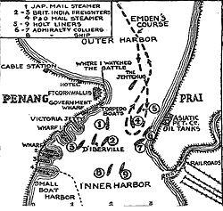 At about 04:30 on 28 October, the Emden appeared off the George Town roads to attack the harbour defenses and any enemy vessels she might find there. Captain von Müller had disguised his ship by rigging a false smoke stack, which made the Emden resemble the British cruiser HMS Yarmouth (1911). Once he had entered the harbor, however, he ran up the Imperial German naval ensign and revealed his identity to one and all. He then launched a torpedo at the Imperial Russian protected cruiser Zhemchug, following it up with a salvo of shells which riddled the ship. As the Zhemchug struggled to return fire, von Müller launched a second torpedo. It penetrated the Zhemchug's forward magazine, causing an explosion that sank the Russian warship.[1] Casualties among the Zhemchug's crew of 250[4] amounted to 88 dead and 121 wounded.[5]