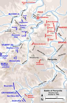 The first shots of the battle were fired early on the morning of October 8. Finding that there were algae-covered pools of water in the otherwise dry bed of Doctor's Creek, troops from the 10th Indiana advanced to take advantage of them. They encountered the forward men of the 7th Arkansas and some shots were exchanged. At 2 a.m., Buell and Gilbert, the III Corps commander, ordered newly promoted Brig. Gen. Phil Sheridan to seize Peters Hill; Sheridan started off with the brigade of Col. Daniel McCook (the younger brother of the I Corps commander). Sheridan seized the hill, driving the Arkansans back to the main line of their brigade, but continued to push across the creek. Liddell's brigade could not check the momentum of Sheridan's thirsty soldiers and Buckner, Liddell's division commander, was ordered by Polk not to reinforce him, but to pull his brigade back. Polk was concerned about starting a general engagement to the west of the Chaplin River, fearing he was outnumbered. Meanwhile, on the Union side, a nervous Gilbert ordered Sheridan to return to Peters Hill.[37]