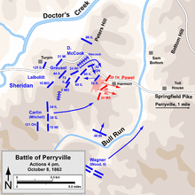 Sheridan's division did participate toward the end of the battle. The Confederate brigade of Col. Samuel Powel (Anderson's division) was ordered to advance in conjunction with Adams's brigade, on Cleburne's left. The two brigades were widely separated, however, with Powel's on Edwards House Hill, immediately west of Perryville. At about 4 p.m., Powel received orders from Bragg to advance west on the Springfield Pike to silence the battery of Capt. Henry Hescock, which was firing into the left flank of Bragg's assault. Bragg assumed this was an isolated battery, not the entire III Corps. Three regiments of Powel's brigade encountered Sheridan's division, and although Sheridan was initially concerned by the Confederates' aggressive attack and sent for reinforcements, the three regiments were quickly repulsed.[58]