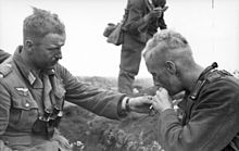 The advance of Soviet armour down Hill 252.2 was disrupted when they reached the anti-tank ditch at the base of the hill. A number of tanks crashed into the 15-foot deep ditch while others moved along the edge looking for a way to cross. Heavy fire was exchanged between the Soviet tanks and two companies of a panzergrenadier battalion on the opposite side of the ditch.[136] Peiper's surviving panzergrenadiers engaged the Soviet infantry and attacked the Soviet tanks with Hafthohlladung magnetic anti-tank grenades. Twenty of his battalion's half-tracks were lost in the fighting, some destroyed in ramming the much heavier Soviet tanks in an effort to stop them.[137] Eventually, due to heavy Soviet pressure and dangerously exposed flanks, Leibstandarte withdrew from the Oktyabrsky State Farm and established firmer defensive lines 1 kilometre (0.62 mi) to the south.[138]