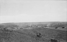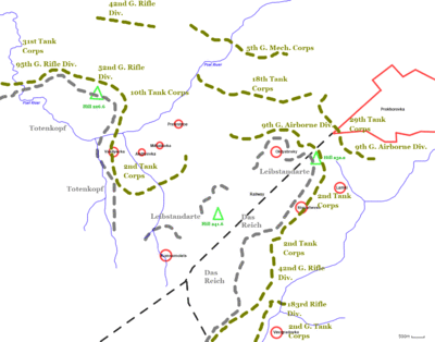 By day's end on 11 July Leibstandarte had advanced deep into the Soviet third defensive belt.[66] They had moved up the Psel corridor, cleared Soviet resistance at the Oktyabrsky ("October") State Farm (Russian: Совхоз Октябрьский), crossed a 15-foot (4.6 m)-deep anti-tank ditch at the base of Hill 252.2 and seized the hill itself after a brief but bloody battle,[67] leaving them only 3 kilometres (1.9 mi) south of Prokhorovka.[66] To its northwest, the panzergrenadiers of Totenkopf had achieved a bridgehead across the Psel and tanks had been brought across, but they had yet to take Hill 226.6 and there was a 5-kilometre (3.1 mi) gap between Totenkopf and Leibstandarte. To the south of Leibstandarte, Das Reich had also met stiff resistance and lagged behind some 4 kilometres (2.5 mi).[65] With its advance, Leibstandarte was exposed on both of its flanks.[67]