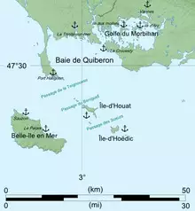 Brest was the obvious starting point for the expedition: it was a major port; it was well placed with regard to the prevailing winds; and departure from it minimised the sailing distance and time to the proposed landing site.[7] However, Brest was at the end of a long and relatively infertile peninsula, which made supporting a large number of men there difficult; supplies of food had to come in by sea and were vulnerable to the British blockade.[14] A typhoid epidemic in Brest during 1757–1758 killed over 4,000 French seamen, greatly exacerbating their shortage of experienced sailors.[15] In addition, there was fear of a recurrence of the typhus outbreak. Therefore, the army assembled at Vannes and its transports gathered around the Gulf of Morbihan; the terrain was more fertile, the anchorage was large and sheltered, and men and supplies could readily be despatched from Bordeaux, Rochefort, Nantes, or Orléans.[16]