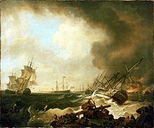 During the first week of November, a westerly gale came up and, after three days, the ships of Hawke's blockade were forced to run for Torbay on the south coast of England. Robert Duff was left behind in Quiberon Bay, with a squadron of five 'fifties' (ships of the line with 50 cannons) and nine frigates to keep an eye on the transports.[21] In the meantime, a small squadron from the West Indies joined Conflans in Brest and, when an easterly wind came on the 14th, Conflans slipped out. He was sighted by HMS Actaeon which had remained on station off Brest despite the storms but which failed to rendezvous with Hawke, by HMS Juno & Swallow which tried to warn Duff but were apparently chased off by the French, and by the victualler Love and Unity returning from Quiberon, which sighted the French fleet at 2 pm on the 15th, 70 miles west of Belle-Isle.[22] She met Hawke the next day and he sailed hard for Quiberon into a SSE gale. Meanwhile, HMS Vengeance had arrived in Quiberon Bay the night before to warn Duff and he had put his squadron to sea in the teeth of a WNW gale.[23]