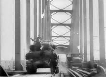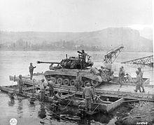 The railroad tracks on the bridge were covered with wood planks, allowing vehicles to pass.[34] Once on the bridge, the American infantry came under fire from German snipers on a partially submerged boat on the east bank and MG 42 machine gun fire from the eastern towers of the bridge, as well as from houses in Erpel. A 14th Battalion Sherman tank destroyed the boat.[40]:11 All the tanks joined in shelling the opposite side of the river and the infantry covered the bridge and eastern side with machine gun fire, enabling ground troops to get on the bridge. The tanks successfully provided fire support to the infantry and suppressed fire from the German positions.[40]:11[49]