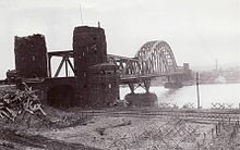 During the fall of 1944, the Allies had repeatedly attempted to destroy the bridge to disrupt German efforts to reinforce their forces to the west. On 9 October 1944, a raid by 33 bombers damaged the bridge and it was reported as destroyed, but the bridge was back in use again on 9 November. A few weeks later on 28 December 1944, 71 B-24 Liberator bombers were dispatched to strike the bridge. They hit it with four bombs but the Germans quickly repaired it.[18] The 446th Bombardment Group attacked the bridge again on the next four consecutive days from 28 to 31 December 1944.[19] More bombers struck at the bridge during raids in January and February 1945.[14] On 5 March 1945, B-24 bombers from the 491st Bombardment Group attempted one more time to destroy the bridge, but failed.[20]