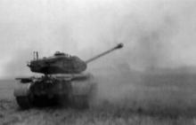 At 1:50 pm, the troops of A/27/9 AIB set out for the town. Thirty minutes later, Engemann led the 17 tanks of A/14/9 AIB forward. The troops and tanks arrived at about the same time and advanced quickly through Remagen against light resistance. The Germans relied for local defense on Volksturm, citizens who were conscripted close to their homes in the belief that they would defend their towns and villages. German defensive policy did not include planning for defending rear areas in depth. There were no antitank ditches or mines, barbed wire, or trenches on the route to Remagen. The few defensive obstacles that had been constructed were too weak to block tanks or had been placed in open terrain, and the roadblocks they had built usually allowed plenty of room for vehicles to pass.[37][42] The only defense that slowed the Americans down was a machine gun manned by infantry over the town square, which two of the Pershings quickly dispatched. Relatively unmolested, the Americans arrived in strength at the western end of the bridge and the tanks began covering the bridge and the east shore with tank rounds, destroying a locomotive attached to a string of freight cars on the rail line parallel to the river.[32][34]