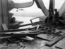 Company commander 2d Lt. Timmermann led an under-strength squad of men from the 27 AIB onto the west side of the bridge, despite the risk that the bridge could be destroyed with them on it.[42] Just as the Americans approached, Corporal Faust set off the secondary explosives.[17] Both the Germans and the Americans watched the smoke and haze clear from the explosion and were shocked to see the bridge was still standing. Only the charge on the southeast pier, two-thirds of the way across, had exploded, but the weak industrial explosive had failed to bring down the well-built steel bridge.[34]
