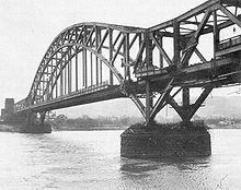 The bridge connected the village of Erpel on the eastern side with Remagen on the west bank. It had been named after the World War I German General Erich Ludendorff, who had been a key proponent for building this bridge. It carried two rail lines and pedestrian catwalks on either side across the Rhine. The total length was 400 metres (1,300 ft), while the main steel structure was 325 metres (1,066 ft) long. The arch spanned 156 metres (512 ft) and at its highest measured 28 metres (92 ft) above the water. Two trusses on either side of the central arch were both 85 metres (279 ft). An elevated overpass on each end of the span connected the approach to the bridge and allowed a rail line or roads to pass underneath, parallel to the river. The bridge was normally about 15 metres (49 ft) above the Rhine. Since it was built for military purposes, it had solidly built stone towers on either side of the rails on both banks, equipped with fighting loopholes and accommodations for up to a battalion of troops.[2] On the eastern side, a 1,299-foot-long (396 m) tunnel was cut at almost 90° through Erpeler Ley, a steeply sided hill that overlooks the Rhine.[14]