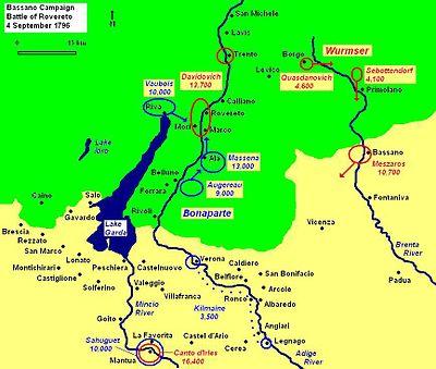 Vaubois, with 10,000 men, lay to the west of Lake Garda. He put General of Brigade Jean Joseph Guieu and his brigade in boats, while his other two brigades marched north past Lake Idro to Riva del Garda at the northern end of the lake. Joined by Guieu, Vaubois turned east toward Rovereto. Bonaparte sent Masséna's 13,000 troops advancing directly north up the Adige valley while Augereau's 9,000 men struggled through the mountains north of Verona.[8]