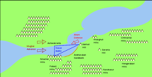 Meanwhile, Mughal reinforcements in the shape of war-vessels and imperial officers (Omraos) reached Ram Singh, along with the Mughal admiral, Munnawar Khan and the Mughal Viceroy Shaista Khan, sent the message that Ram Singh was sent to fight the Assamese, not make friends with them.[18] Ram Singh now made preparations for his final and direct assault on Guwahati and began moving along the northbank. Near Sualkuchi he was joined by ships with artillery and archers under five sardars. The Mughals had large boats, some carrying as many as sixteen cannons. The Mughal ambassador, Paditrai, had reported a breach in the embankment at Andharubali a few days earlier, and Ram Singh wanted to exploit this opening.[19]