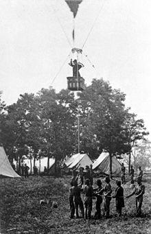 The Army of the Potomac was accompanied by the Union Army Balloon Corps commanded by Prof. Thaddeus S. C. Lowe, who had established two balloon camps on the north side of the river, one at Gaines's Farm and one at Mechanicsville. Lowe reported on May 29 the buildup of Confederate forces to the left of New Bridge or in front of the Fair Oaks train station.[14] With constant rain on May 30 and heavy winds the morning of May 31, the aerostats Washington and Intrepid did not launch until noon. Lowe observed Confederate troops moving in battle formation and this information was relayed verbally to McClellan's headquarters by 2 p.m.[14] Lowe continued to send reports from the Intrepid via telegraph the remainder of May 31. On June 1, Lowe reported that the Confederate barracks to the left of Richmond as being free from smoke.[15] McClellan did not follow up on this information with a counterattack by his corps north of the Chickahominy River.[16]