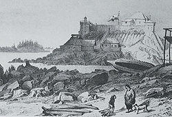 Members of the Kiks.ádi of the indigenous Tlingit people had occupied portions of the Alaska Panhandle, including Sheetʼká Xʼáat'i (present-day Baranof Island), for some 11,000 years.[1] Alexandr Baranov (Chief Manager of the Russian-American Company) first visited the island aboard the Ekaterina in 1795 while searching for new sea otter hunting grounds. Baranov paid the Tlingit a sum for the rights to the land in order to prevent "interlopers" from conducting trade on the island.