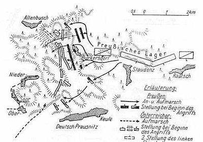 Prussian scouts soon detected the Austrian presence, and drummers and trumpeters sounded the general alarm as Prussians began preparing for battle. Austrian artillery proceeded to fire on the Prussian encampment, while the Prussian army marched into battle.[3]