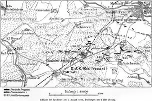 While the French army under General MacMahon engaged the German 3rd Army at the Battle of Wörth, the German 1st Army under Steinmetz advanced west from Saarbrücken. Early on the 6th,[7] a patrol from the German 2nd Army under Prince Friedrich Karl of Prussia spotted decoy fires ahead and saw Frossard's army farther off on a plateau south of the town of Spicheren. Ignoring Moltke's instructions, both German armies attacked Frossard's French II Corps fortified line. [8]
