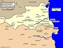 Since invading French Roussillon in April 1793, Captain General Ricardos and his Spanish army won a string of successes over the defending forces of the First French Republic. The Siege of Bellegarde ended with a French capitulation on 24 June 1793.[3] Since June, the Spanish army maintained itself a few kilometers south of Perpignan, the department capital. In early September, Ricardos made a bid to isolate and capture the fortress of Perpignan by sending two divisions around its western side to cut the road to Narbonne. Meanwhile, he bombarded the city from the south. French troops under General of Division Eustache Charles d'Aoust and General of Brigade Jacques Gilles Henri Goguet attacked the positions of Spanish Lieutenant General Jerónimo Girón-Moctezuma, Marquis de las Amarilas at Peyrestortes and Lieutenant General Juan de Courten at Le Vernet. The resulting Battle of Peyrestortes on 17 September was an important French victory. The badly shaken Spanish army regrouped near Trouillas.[4]