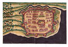 The village of Baçaim itself and the large Maratha camp at Bhadrapur were to the north.[26] Within the fort itself, the towers of São Sebastião and Remedios faced the Marathas at Bhadrapur. The barracks and everything else was inside, with the main gate facing the Vasai creek. Chimaji Appa began the siege on the 1st of May 1739 by laying 10 mines next to the walls near the tower of Remedios. Maratha soldiers charged into the breach caused by exploding four of them. Almost immediately, they came under fire from Portuguese guns and muskets. Chimaji Appa, Malhar Rao Holkar, Ranoji Shinde and Manaji Angre goaded their contingents to scale the walls throughout the day. Next day on 2 May, the tower of São Sebastião and Remedios were repeatedly attacked. More mines were set off during the day, causing large breaches in the walls, between the two towers. Around 4,000 Maratha soldiers tried to pour into the fort, but the Portuguese opposition was fierce. They also managed to defend the two towers by lighting firewood. On 3 May, the tower of São Sebastião was demolished by a Maratha mine. Maratha armies could now easily march into the fort, without the fear of being fired upon from the tower. The encirclement and defeat of the Portuguese was complete. Chimaji Appa decided to settle the war at this point by sending an envoy to the Portuguese. In his letter, he warned them that the entire garrison would be slaughtered and the fort levelled if the war continued. The Portuguese commander in charge of the fort duly surrendered on 16 May 1739.[27] On 23 May 1739, the saffron flag flew atop Baçaim.[28]