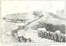 Grant wanted to overwhelm the Confederates before they could fully organize their defenses and ordered an assault against the Stockade Redan for May 19. Troops from Sherman's corps had a difficult time approaching the position under rifle and artillery fire from the 36th Mississippi Infantry, Brig. Gen. Louis Hébert's brigade. They had to negotiate a steep ravine protected by abatis and cross a 6-foot-deep (1.8 m), 8-foot-wide (2.4 m) ditch before attacking the 17-foot-high (5.2 m) walls of the redan. This first attempt was easily repulsed. Grant ordered an artillery bombardment to soften the defenses and at about 2 pm, Sherman's division under Maj. Gen. Francis P. Blair tried again, but only a small number of men were able to advance even as far as the ditch below the redan. The assault collapsed in an exchange of rifle fire and hand grenades lobbing back and forth.[13]