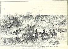 McPherson's corps was assigned to attack the center along the Jackson Road. On their right flank, the brigade of Brig. Gen. Thomas E. G. Ransom advanced to within 100 yards of the Confederate line, but halted to avoid dangerous flanking fire from Green's Redan. On McPherson's left flank, the division of Maj. Gen. John A. Logan was assigned to assault the 3rd Louisiana Redan and the Great Redoubt. The brigade of Brig. Gen. John E. Smith made it as far as the slope of the redan, but huddled there, dodging grenades until dark, when they were recalled. Brig. Gen. John D. Stevenson's brigade advanced in two columns against the redoubt, but their attack also failed when they found their ladders were too short to scale the fortification. Brig. Gen. Isaac F. Quinby's division advanced a few hundred yards, but halted for hours while its generals engaged in confused discussions.[19]